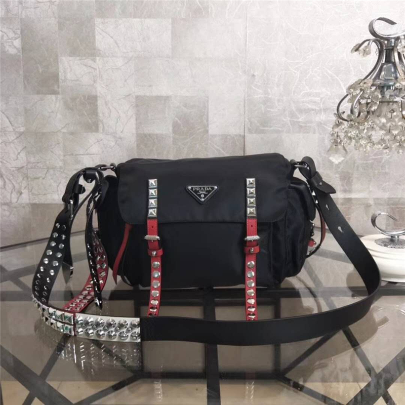 1BD118 Prada普拉達(dá)  尼龍面料 鉚釘裝飾 單肩包 黑配紅