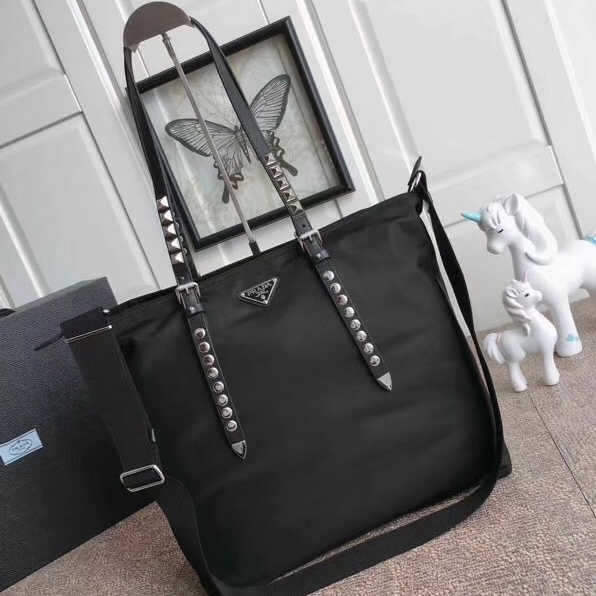 1BG212 Prada女包 鉚釘裝飾 尼龍面料 普拉達手提包 Prada單肩包 黑色