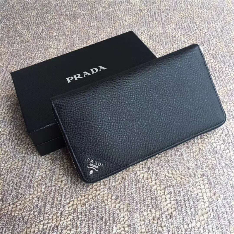 2M1188 Prada普拉達(dá) 十字紋牛皮 三角標(biāo) 男士手包 長款錢夾 黑色