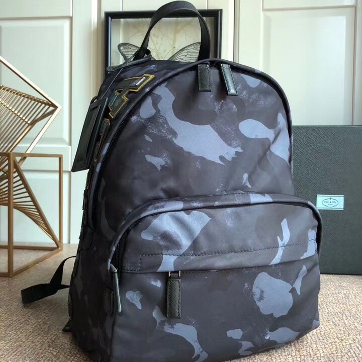 • 2VG066 Prada背包 迷彩印花 織物面料 普拉達(dá)雙肩包 灰藍(lán)色
