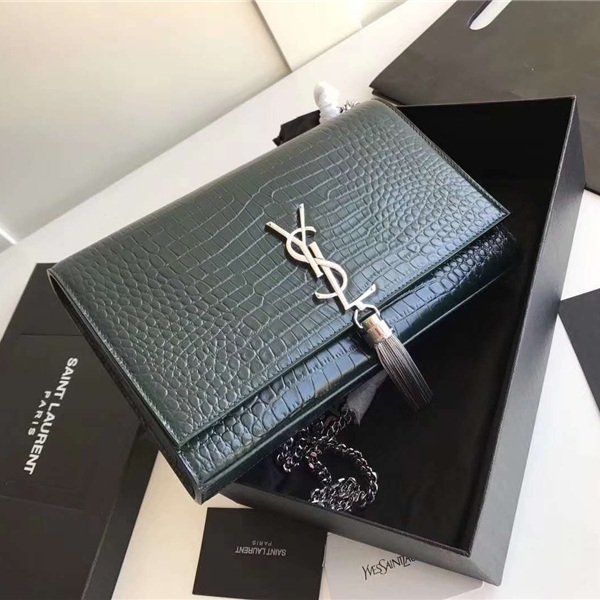 326076 YSL圣羅蘭 專柜最新 細鱷魚紋 流蘇包 墨綠銀鏈