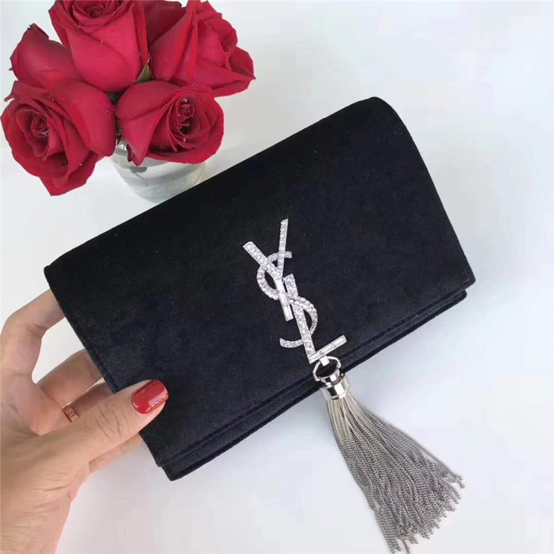 • 491521 YSL圣羅蘭 天鵝絨 帶鉆五金 手拿肩背 流蘇兩用包 黑色