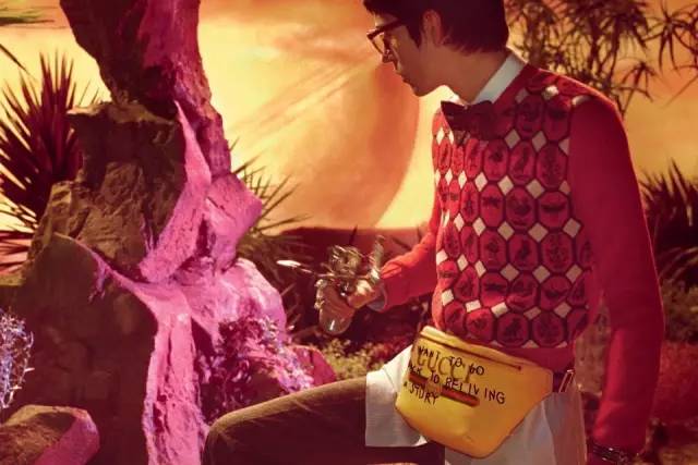 Gucci 繼續自己大受歡迎的華麗復古風,配合上世紀中葉背景下的未來迷幻主義,在混亂和荒誕的環境中,展現出一種獨特而夸張的美感。