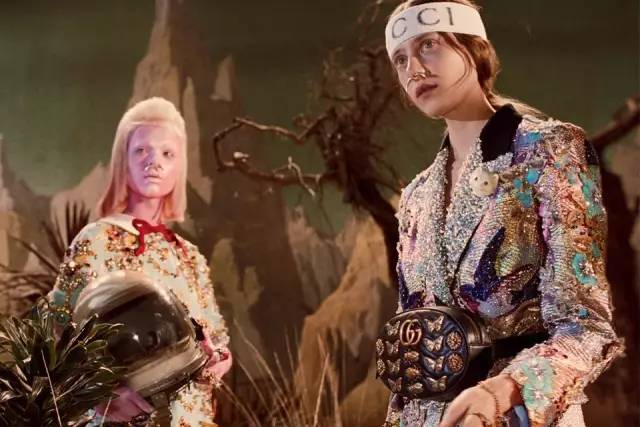 7月25日,Gucci正式發布了2017秋冬廣告大片《Gucci and Beyond》。此前視頻中出現的外星人,身著Gucci秋冬系列服裝,置身于科幻感十足的迷離外太空,超現實主義、迷幻的外層空間景觀和前衛的復古宇宙飛船內部創造了狂野的環境營造了一種神秘氛圍。