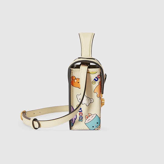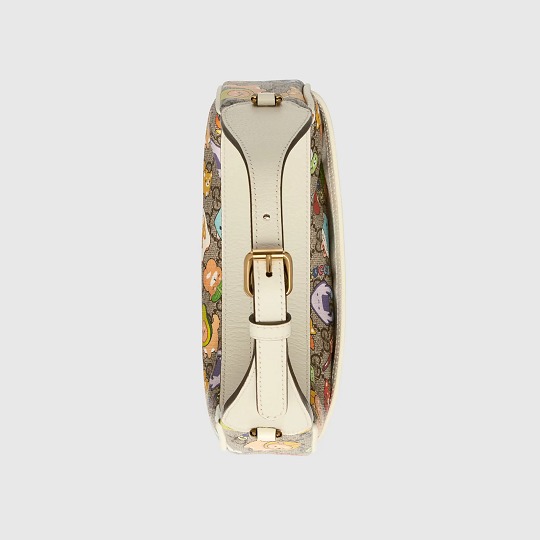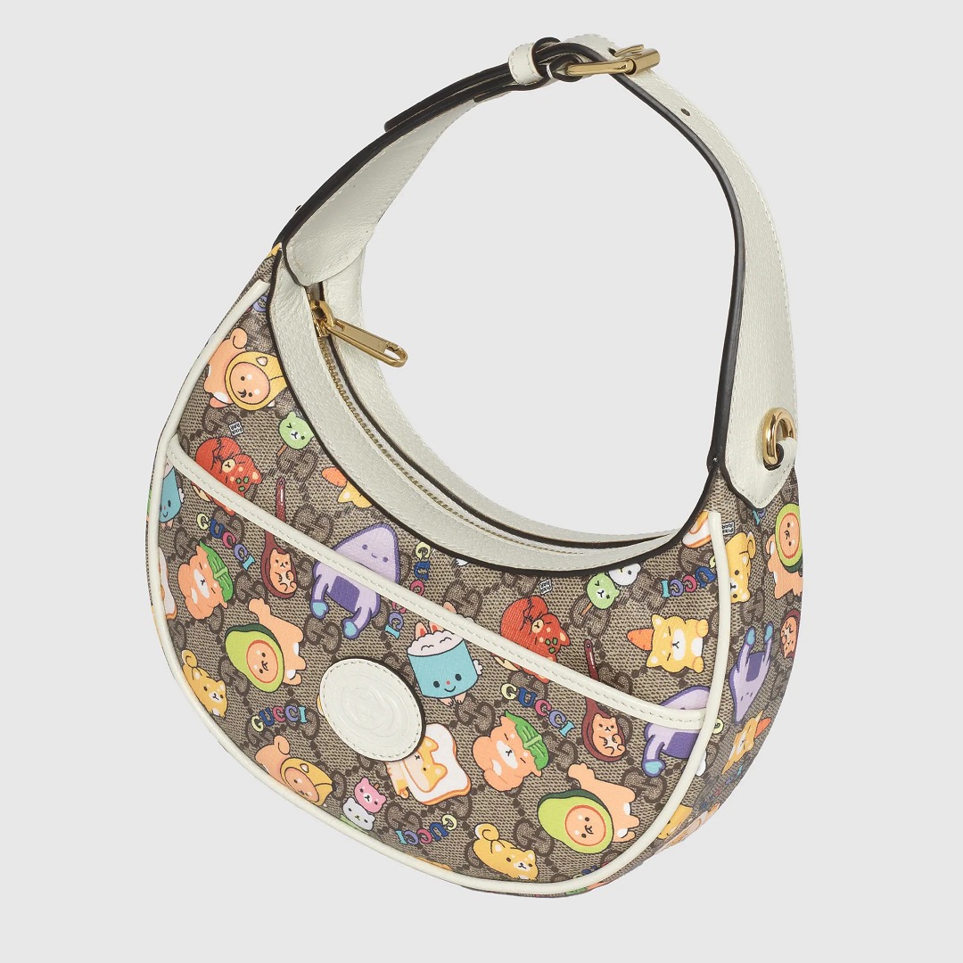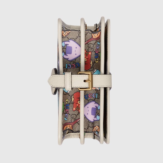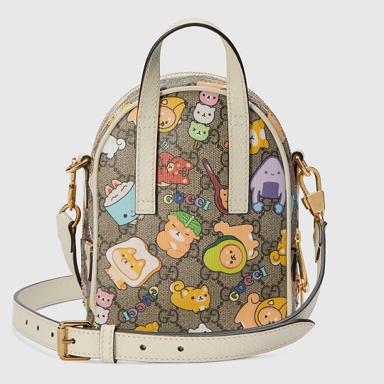 GG Supreme 帆布系列搭配白色皮革細節,色調清爽又富有活力,熱鬧的小動物聚會插畫看點滿滿。迷你手拎包采用俏皮的月牙輪廓,可拆卸鏈條肩帶實現多種背法。同系列還有迷你托特包、小號托特包、多功能肩背包、郵差包、腰包等多款包型,中性設計也可以搭配成情侶包出街。