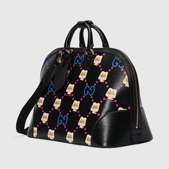 大號旅行包以黑色皮革為背景,搭配醒目的熒光粉和紫色 GG 印花和吐司柴犬圖案,38x28x20cm的尺寸適合假期短途出行,萌趣印花為旅途增添愉悅心情。