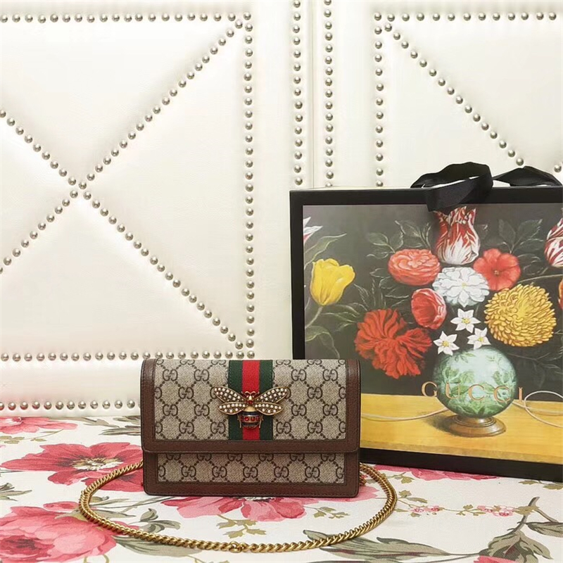 queen Margaret瑪格麗特皇后系列包包最早推出于2017年,口碑一直很好,是古馳最受歡迎的女包系列之一,這個系列的標(biāo)志也是蜜蜂元素,象征智慧可愛的蜜蜂很精致,翅膀鑲嵌珍珠或者水晶,整體優(yōu)雅大氣,很討喜,雖然日常穿搭略顯浮夸,但是絕對吸睛,價格一般在4100~2.5萬不等。MAIGOO小編最推薦其中的鏈條包,非常適合夏天背,細(xì)鏈條背起來也不像酒神包那么重,皮質(zhì)很軟,容量不是很大,總的來說是比較值得入手