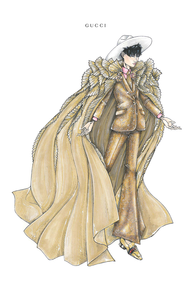 率先曝光的造型為金色紗質(zhì)披風(fēng)飾以褶皺荷葉邊,以及金色提花西裝,內(nèi)搭淡粉色襯衫,搭配同款領(lǐng)帶,象牙色小禮帽與金色樂(lè)福鞋。