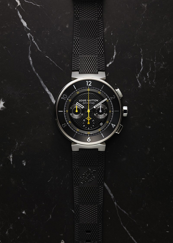 技術參數:精鋼表殼,表徑41.5毫米,黑色噴砂霧面表盤,類Damier Graphite花紋顆粒圖案,清晰易讀GMT功能,采超大黃色V字指針,時、分、秒、GMT,自動上鏈機芯,動力儲存42小時,表底刻有LV字樣,防反光藍寶石水晶玻璃鏡面,防水50米,路易威登專利可自行更換表帶。
