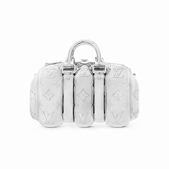 Keepall Clutch Blown Up 手拎包采用銀色金屬打造,通過(guò)18小時(shí)塑形成「充氣」風(fēng)格,鏡面拋光營(yíng)造出閃耀光影,再耗時(shí)4小時(shí)制作內(nèi)襯等細(xì)節(jié),極具創(chuàng)意;Crushed 軟箱包采用銀色牛皮制作,內(nèi)層設(shè)置鋁質(zhì)薄片,可擠壓和塑造成不同形狀;Monceau Dstorted 手袋亮點(diǎn)是斜向包頂結(jié)構(gòu),鎖扣和手柄界采用離軸設(shè)計(jì)。