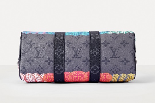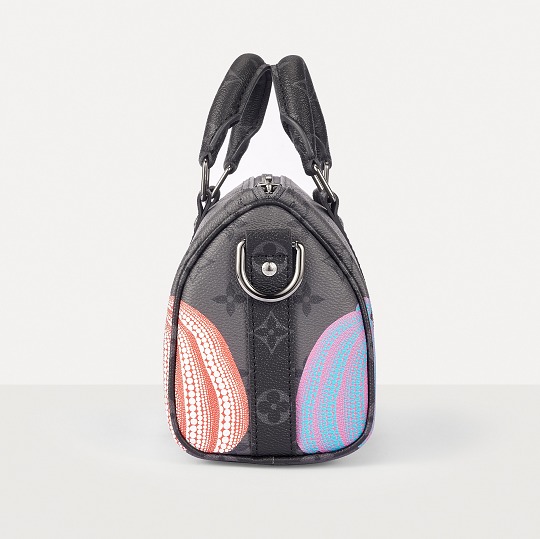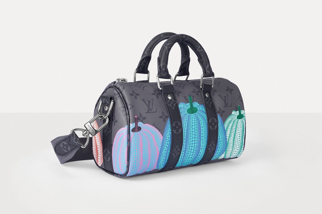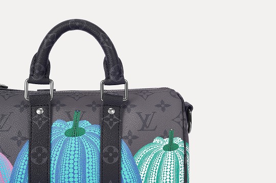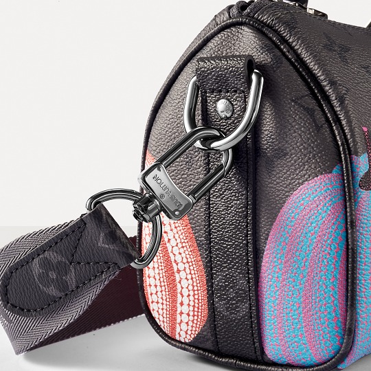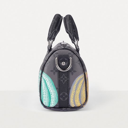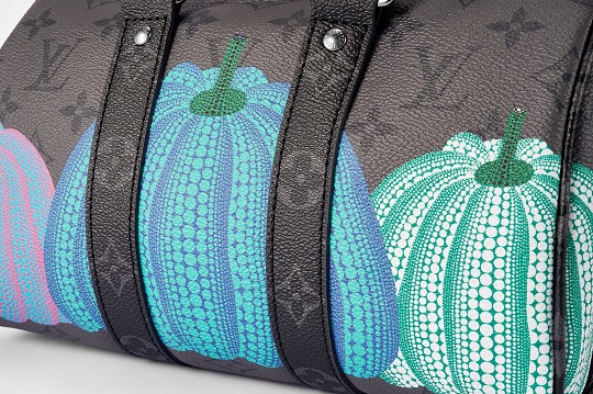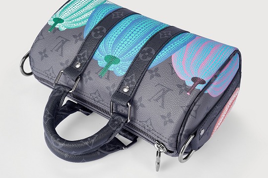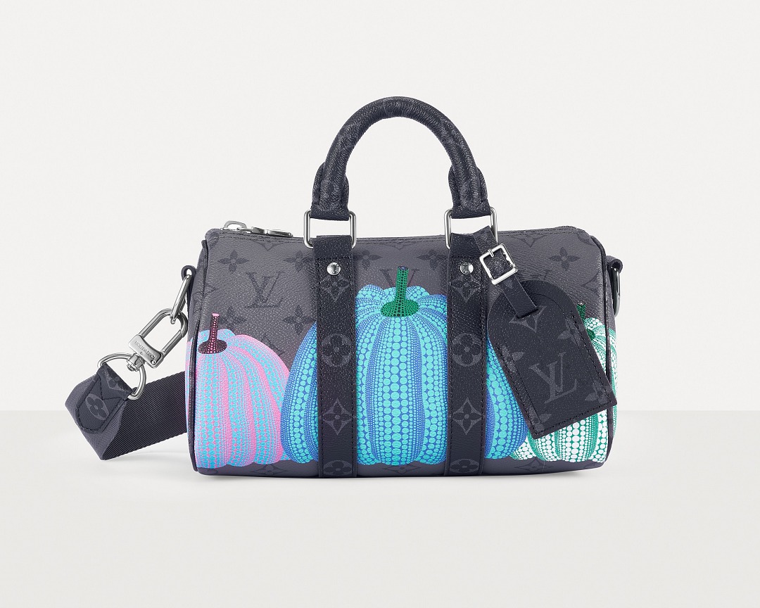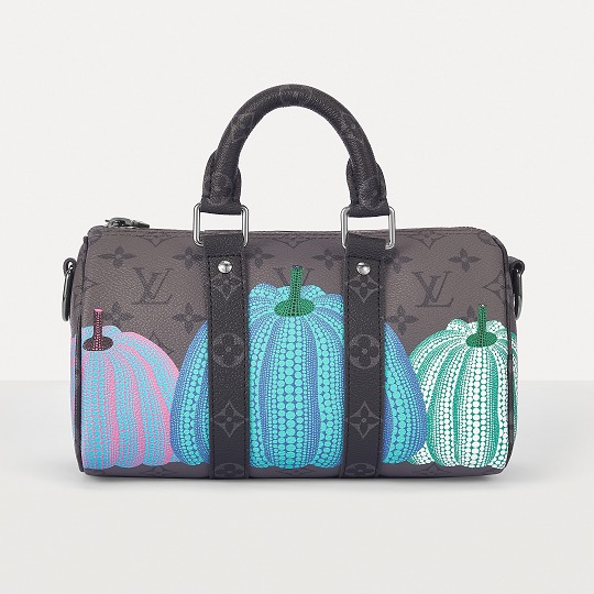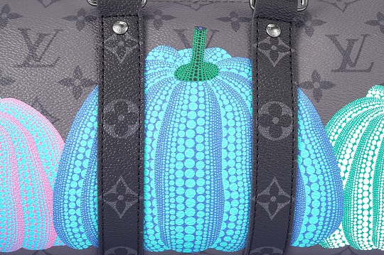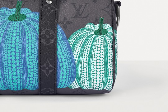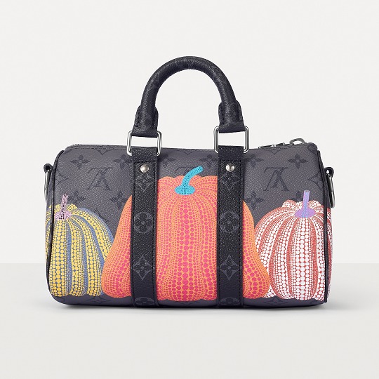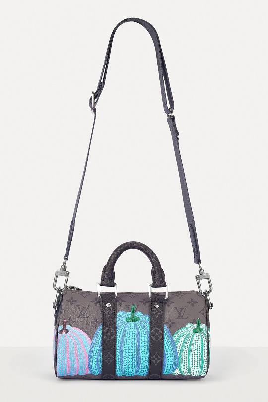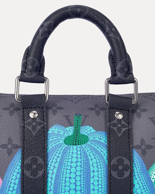 這只 Keepall 25 手袋出自 Louis Vuitton x Yayoi Kusama 草間彌生合作系列第二篇章,以灰黑色 Monogram Eclipse Reverse 涂層帆布為背景,通過絲印工藝在包身描摹波點南瓜肖像,用時尚語言重新詮釋草間彌生眼中溫暖與樂觀的象征。
