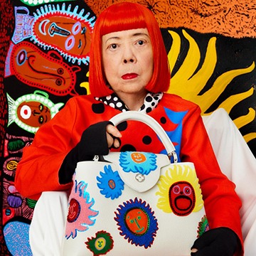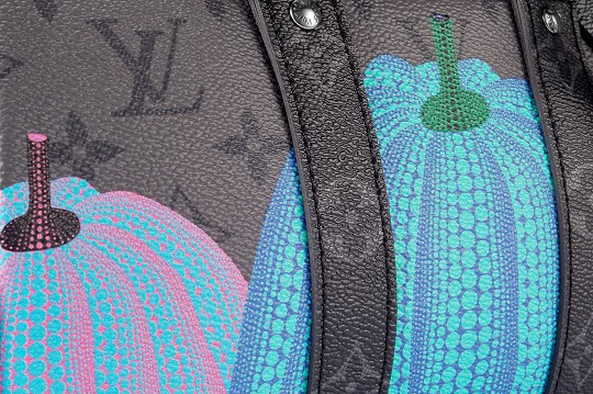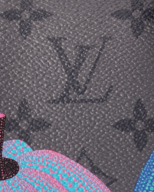 織物里襯上印有草間彌生《南瓜》系列畫作的三角網紋背景圖案,猶如細胞結構般無限重復排列的網反映出草間對永恒概念的省思——在浩瀚宇宙中人類不過是極其渺小的存在。包包背側點綴一枚南瓜造型 LOUIS VUITTON × Yayoi kusama 2023 燙銀皮標,標示出這只包包的限量屬性。