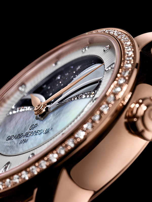 標(biāo)志性的貓眼表殼,為點(diǎn)點(diǎn)星光提供了舞臺(tái),其華麗的橢圓形外觀充滿活力,極具魅力,輕柔地貼合手腕的弧度,使它看上去像一顆真正的寶石。表殼采用玫瑰金制成并鑲有62顆明亮式切割鉆石,與璣鏤雕刻裝飾的珍珠母貝表盤(pán)浪漫輝映。表盤(pán)綴以璣鏤紋飾以及水滴狀的鉆石刻度,將目光引入寬8.9毫米直徑、在59天內(nèi)完成旋轉(zhuǎn)的月相顯示圓盤(pán)。相較一般的月相顯示,其驅(qū)動(dòng)這種復(fù)雜性的月相顯示裝置不與小時(shí)輪的軸心所連接,而是與發(fā)條盒鏈接,使其能夠不帶任何震顫地中平穩(wěn)移動(dòng)。