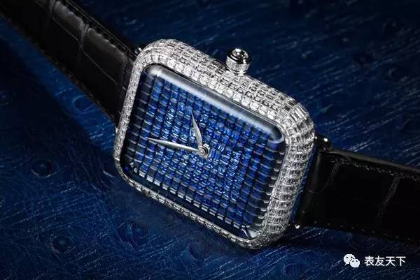 表盤鑲滿232顆矩形切割藍寶石——好似一面屏幕,只不過每個像素都是一顆藍寶 石。同時,長方形表殼鑲滿了矩形切割的鉆石,四角采用優雅的圓潤造型,符合人體工學設計,頗 為精致考究。一千種細微不同的藍色調打造出腕表的單色外觀,這絕對撐得上一款“與世隔絕”之作 ——它承諾重新找回丟失的時間:為您自己、為您的朋友、為您的家人——在您的手腕上,再也沒 有濾鏡,再也沒有各種浪費時間的工具。至少4天的動力存儲,手動即可上滿弦。