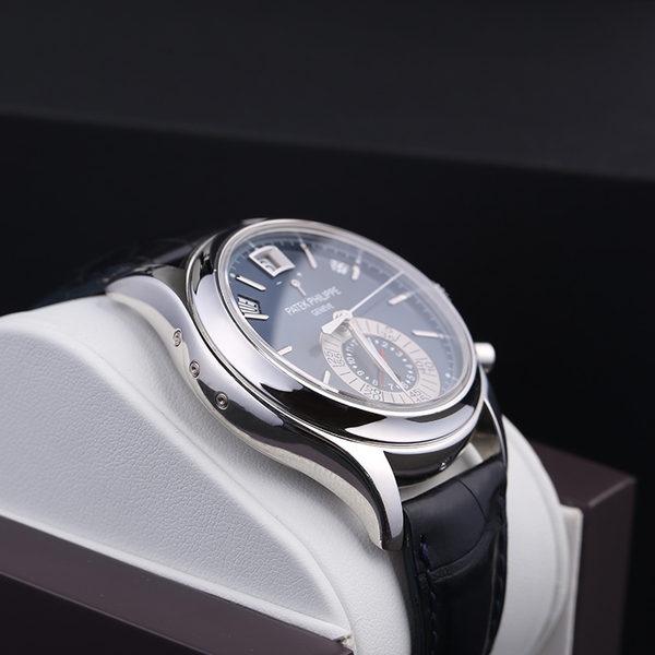 這款百達翡麗5960P是一款男士自動機械手表,手表直徑為40毫米,適合手腕稍細的朋友佩戴。深灰色圓形表盤,藍寶石水晶玻璃表鏡,表冠為950鉑金材質,深棕色鱷魚皮表帶,表扣為950鉑金折疊扣,表底背透,防水性能為30米。