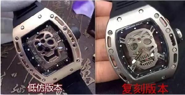理查德米勒骷髏頭頂級復刻版本和低仿版本的對比低版本做工粗糙,細節方面一筆帶過,機芯通常為石英機芯和國產機芯,復刻版本做工精細,每個細節都刻畫到位,機芯也多為復刻原版機芯。