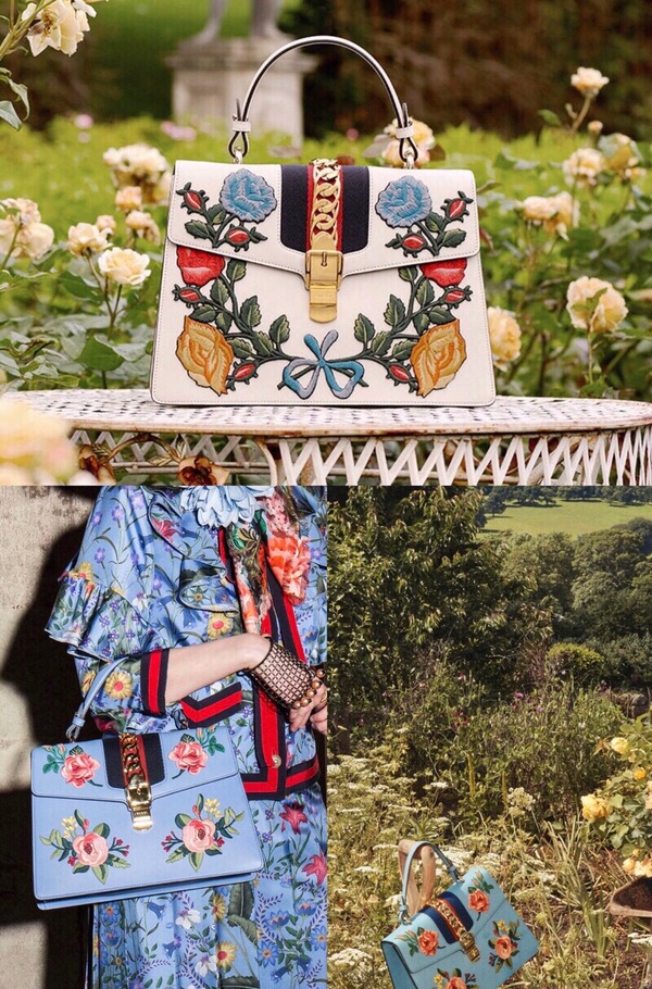 這款設計特別又醒目的Sylvie手袋是2017年度假系列,在真皮下鑲飾尼龍織帶,并飾以經典的金色鏈條和搭扣。最讓人過目不忘的還是精致的花朵貼花刺繡。