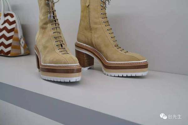我們在后來Hermès預覽中更細致地看到這款靴子的設計。鞋底保留了沙漠靴的厚底,Hermès運用了不同層的顏色對比,非常有設計感,卻依舊是很低調的配色。為了拉長腿型還加上了一點鞋跟,而且靴子特別貼腿型,雖然整體是酷酷的感覺,但穿上特別能凸顯女人味。
