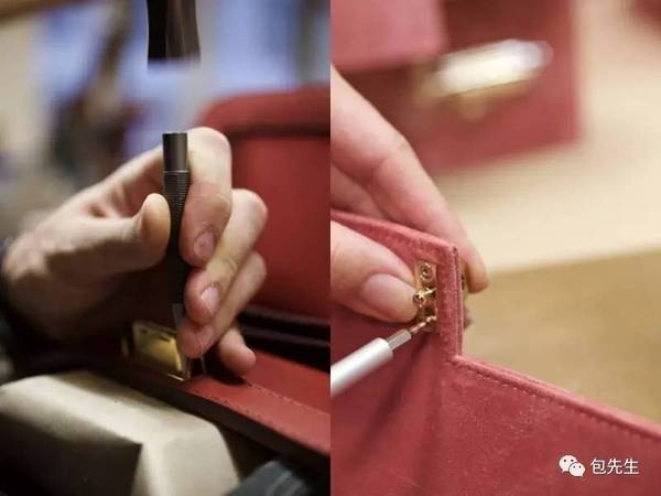 在我們看到的制包的很多環節中,我印象最深刻的就是鉑金包包扣那一步。可能我們在用包的時候都不會太注意到,但是包扣四角圓圓的小突起,其實不是直接隨著金屬件來的,是為了把金屬扣固定在皮上,之后敲上去的。