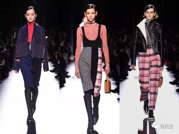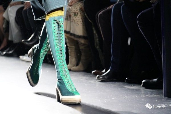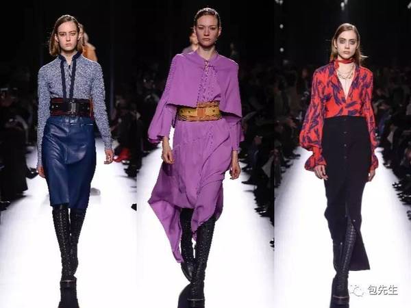 這一季的設計很強調高腰線,尤其使用了很多oversized的皮帶,搭配很高腰設計的裙子,裙擺里都搭配了這一季貫穿始終的沙漠長靴設計,沙漠靴會是2017年一整年的鞋履流行趨勢。