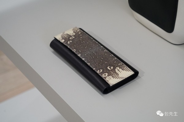去年新推出的Passant錢包,也可以當個簡單的小手包用,手可以從前面的那一塊皮中穿過去拿著。黑色包身搭配黑白染色蜥蜴皮,拿在手上特別顯質感。