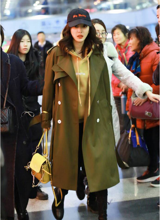 軍綠色大衣搭配硬朗皮靴酷勁十足,米黃色的包包和衛衣內搭顏色呼應,時髦星人大冪冪同樣也背起了雙肩包~芭姐偷偷告訴你,要像冪冪一樣把雙肩包拎在手上更時髦哦~
