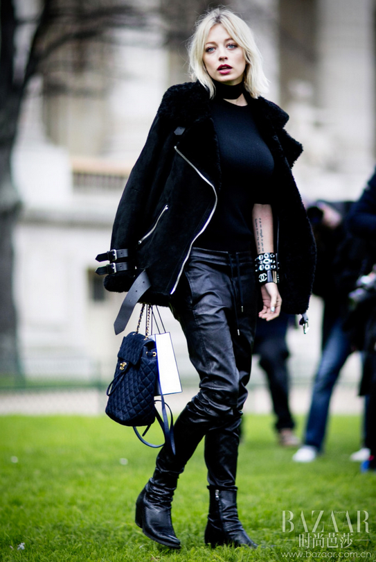 誰說雙肩包一定要背在肩上?時髦精們早早就換了新背法!黑色羊羔絨外套搭配寬松皮褲隨性又炫酷,脖子處的choker增加一份神秘感,拎在手上的格子雙肩包仿佛在叫囂著你看你看我最時髦