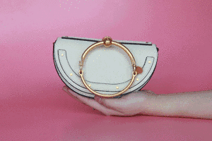 這只包包的最大特色就是金屬圓環(huán),其中圓環(huán)有一半是由兩個(gè)半月形組成,這樣就可以穿過半月形手環(huán)來手拿包包了,還可以順便當(dāng)手鐲。