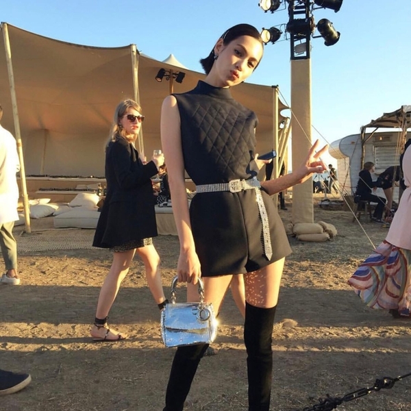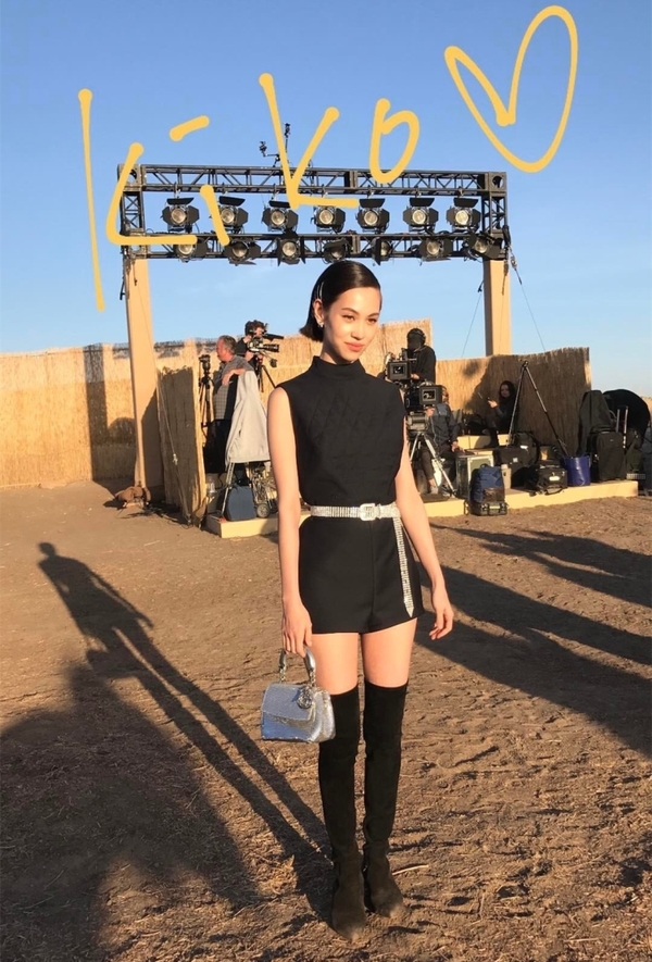 在迪奧2018早春度假秀上,水原希子以一身Dior 2017春夏系列黑色連體褲造型亮相。能“制造”大長腿的短褲、帥氣的半高領(lǐng)設(shè)計,都是水原希子日常穿搭時的心頭好。用在看秀造型中,更是游刃有余。在腰間多系一根閃閃的鉆飾腰帶,整個Look立馬綻放異彩,Dior銀色迷你手提包提升華麗感的同時也與腰帶相呼應(yīng),秀場模特“黑漆漆”的造型瞬間被她比了下去。在黃沙覆蓋的露天秀場,一雙酷酷的過膝靴自然比貓跟鞋更應(yīng)景。俏皮又帥氣,如假包換的“水原希子式”風(fēng)格。