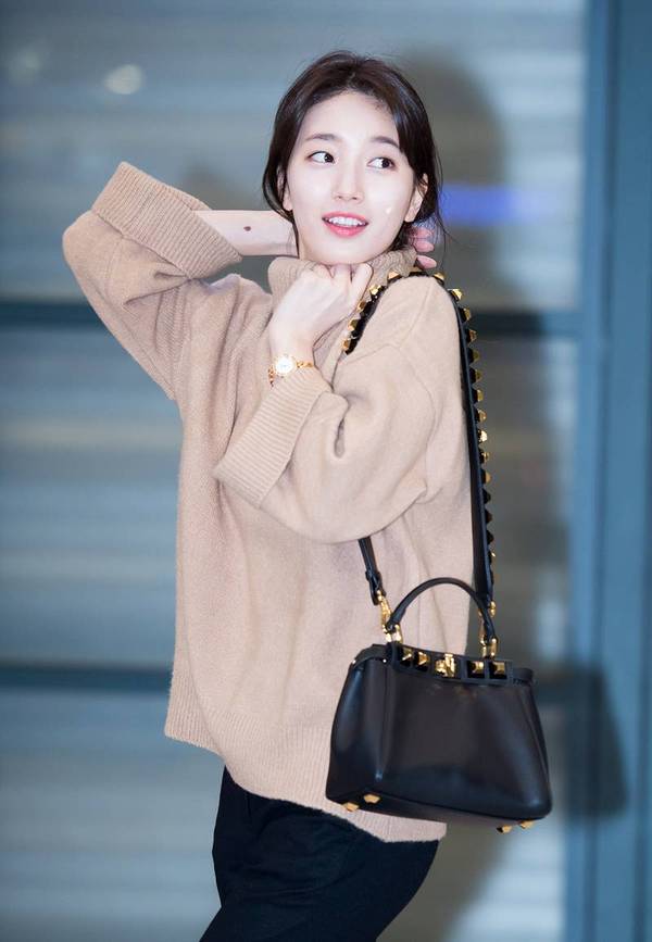 秀智就不止一次帶著Peekaboo出行過,當她毛衣長褲平底鞋的休閑打扮時,帶著的是黑色款。而變身白裙小仙女的時候,又選擇顏色更跳脫的橙色款式。