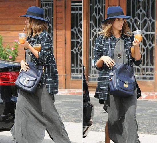 不想用“媽媽包”稱號的大包暴露身份,小編就推薦鮮色又容量適中的水桶包。最好就像杰西卡·阿爾芭(Jessica Alba)一樣,搭配一頂同色系的帽子會更減齡。