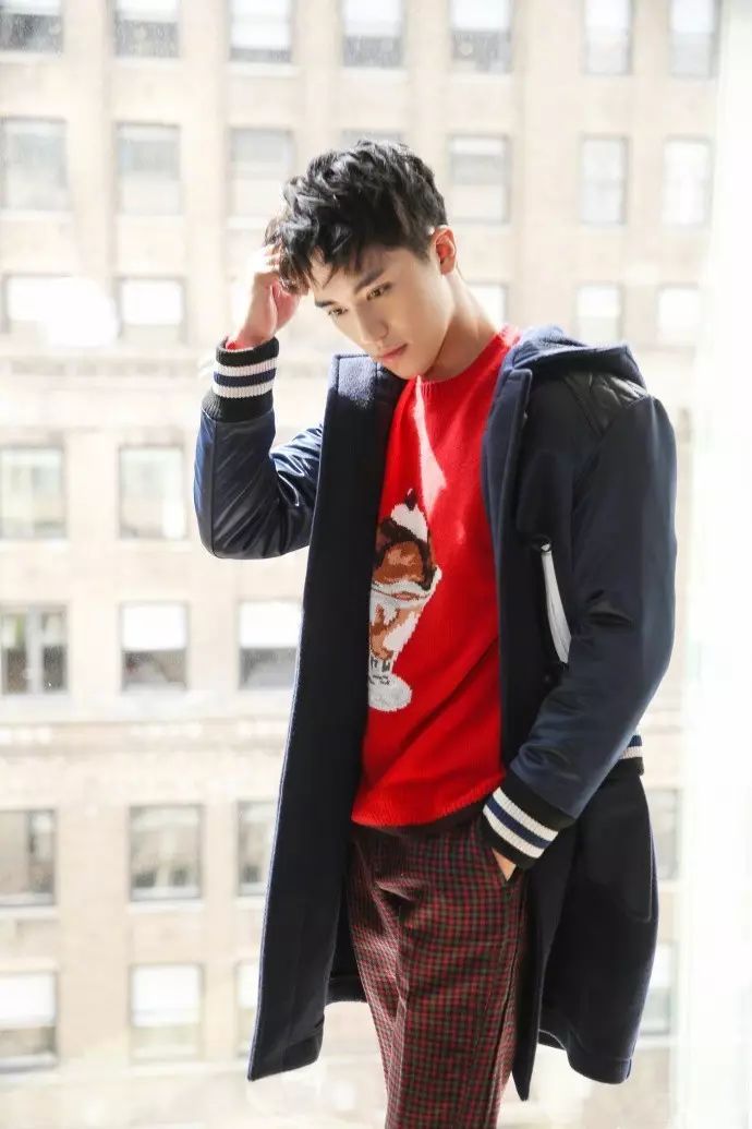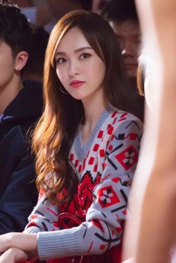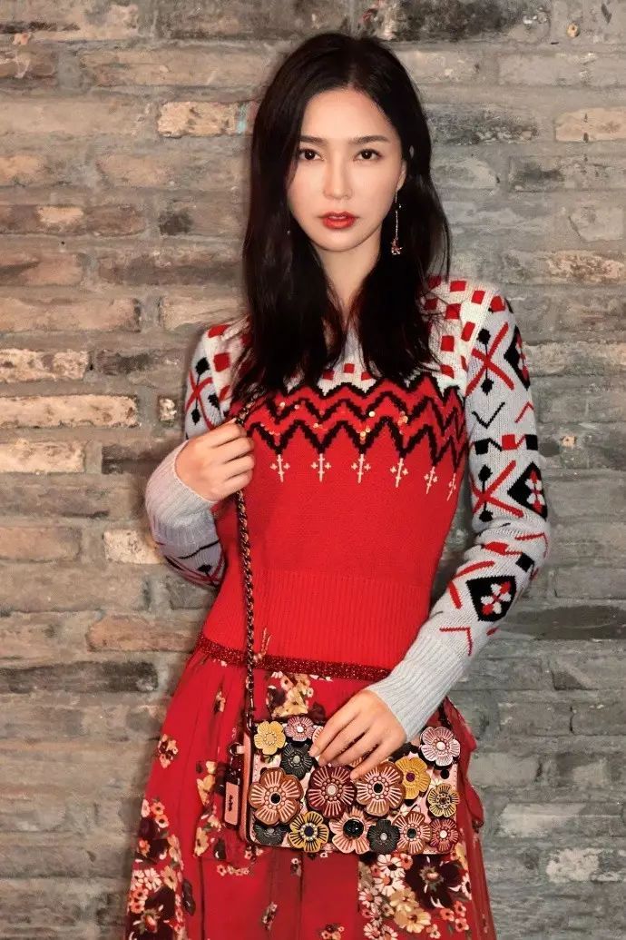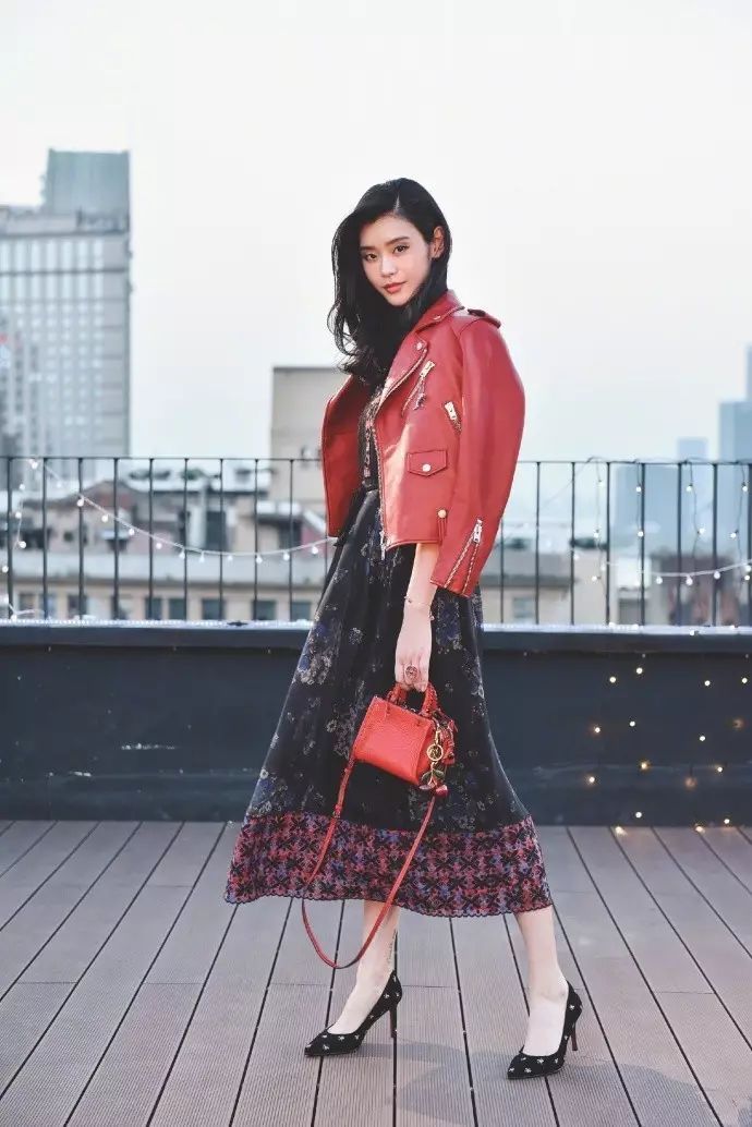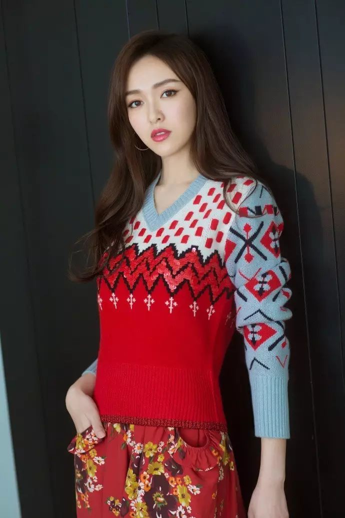 美糖身著紅色印花針織衫搭配印花裙活力十足