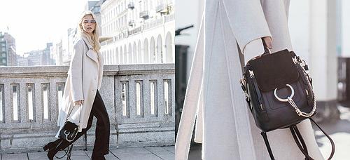 時尚博主Caroline Daur一身白色大衣搭配黑色迷你Faye Backpack漫步在漢堡街頭,優雅中增添了一份酷感。