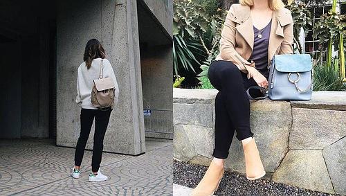 Backpack是以Faye為原型設計出來的,所以兩款包有很多相同的地方,比如都是光滑小牛皮和麂皮的拼接材質,同樣的大圓環和裝飾鏈條,都是梯形的外形,同樣的簡潔時尚美貌