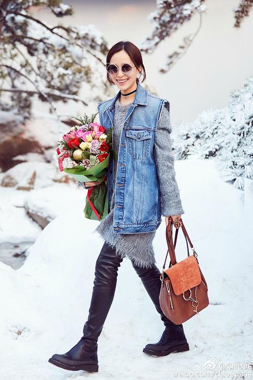 抱著花束的江一燕笑靨盈盈,手拎著Faye雙肩包踏著銀裝素裹的大地走向春天