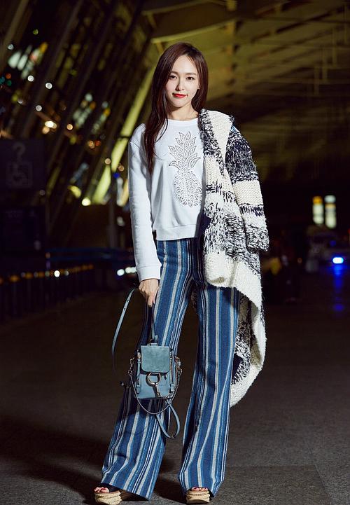 同樣前往參加Chloe大秀的糖糖身著菠蘿紋衛衣搭配條紋闊腿褲,隨意手提Faye雙肩背包,自在摩登