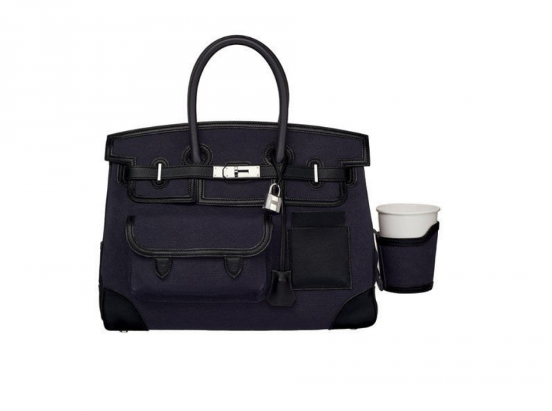 Birkin Cargo其設計靈感來自于軍服多口袋的設計,在包包外層增添了五個小口袋,以及側邊一個可拆卸杯架,大大提升包包的容量。材質則選用Goéland帆布拼接小牛皮,質地柔軟且外型帶著行軍帥氣感。