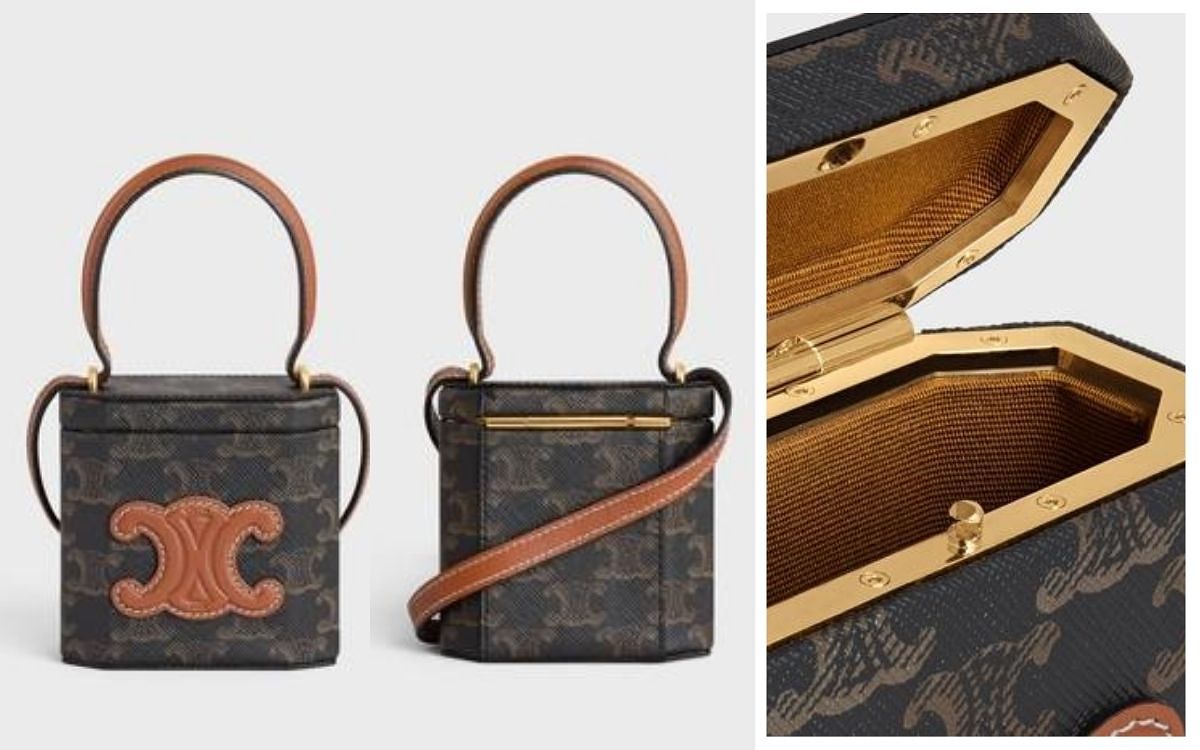CELINE絕對是近期熱門精品包大勢之一,這款皮革大提把及特殊立體八角長包型,風格十分獨特搶眼、存在感極強,加上TRIOMPHE帆布及皮革凱旋門LOGO,既復古又帶一點摩登感,且它還有一條皮革肩帶,讓日常使用時的方便性更加提升!