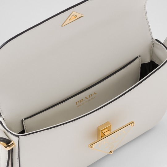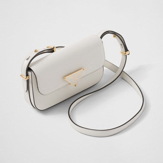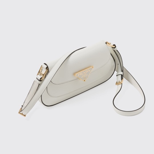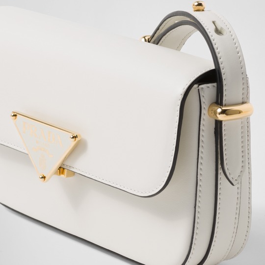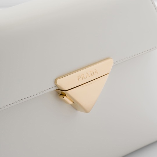 Prada Cleo 擁有圓潤流暢的弧形輪廓,立體花卉通過壓印工藝綻放于纖塵不染的純白色皮革之上,宛如精美的浮雕裝飾,注入一絲浪漫氣息。