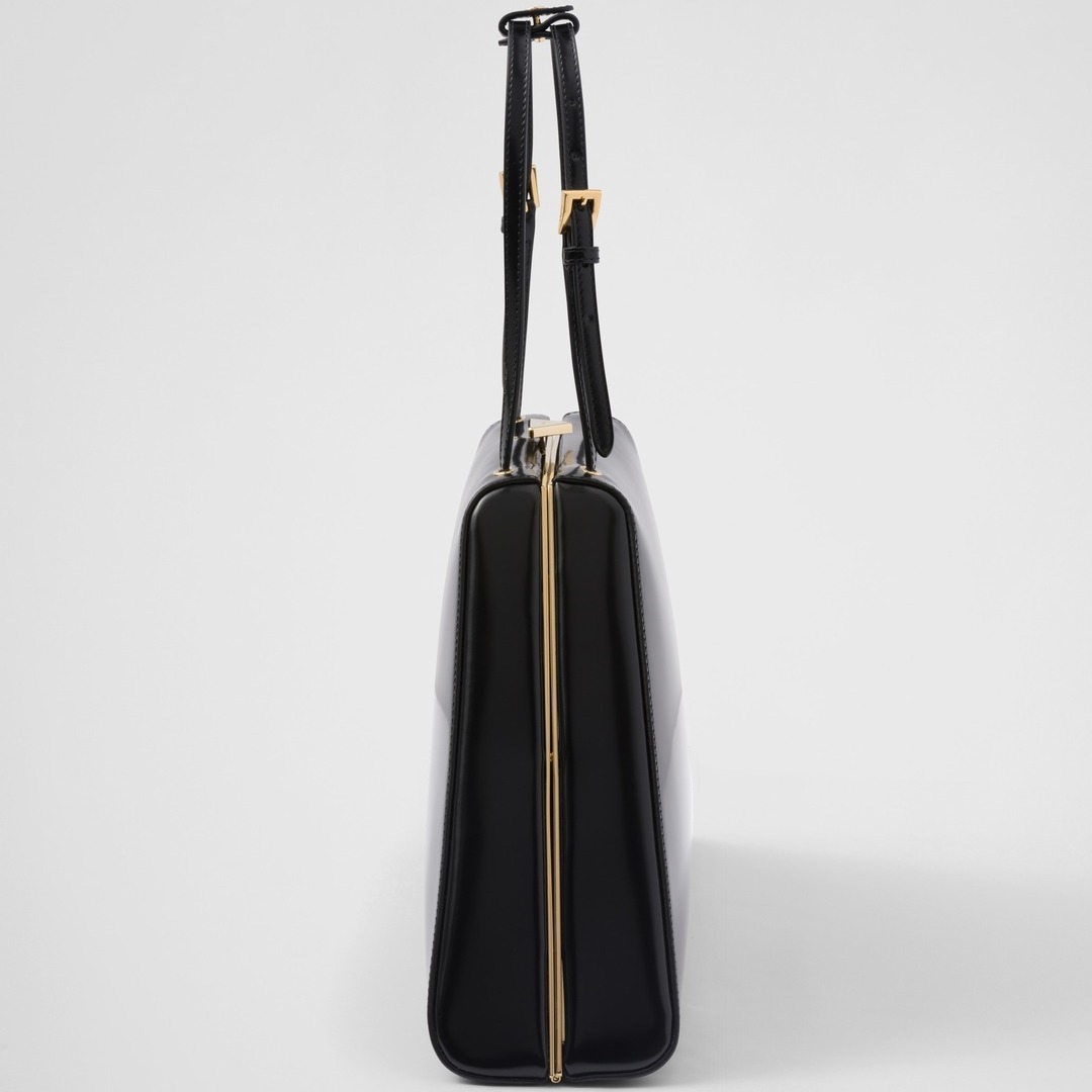 這只梯形手袋采用金屬框架開合,一枚精巧的金色三角包扣點綴于包頂,提手采用可調節長短設計,風格極簡且克制。