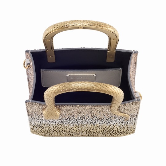 Serpentine 迷你托特包采用白瑪瑙色水晶閃光麂皮材質手工精制而成,表面裝飾不同尺寸的漸變金色璀璨水晶,將挺括的豎款造型與珠寶元素細節巧妙結合,令人不禁聯想到靈蛇的曼妙靈動之姿。