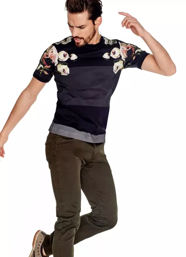 飾以玫瑰圖案的圓領T恤盡顯男士好動的性格, 再配以以品牌設計帥為主題圖案的黑色背包, 絕對令人一見傾心!