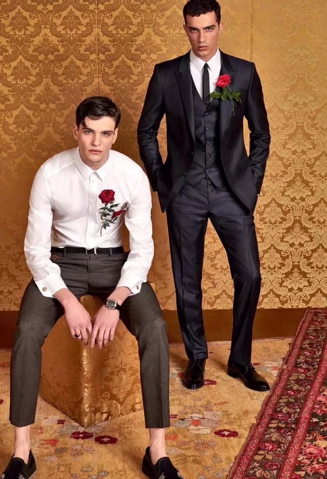 Dolce&Gabbana杜嘉班納2016早秋男裝系列展現男士俊朗及灑脫的個性。白色襯衫綴上精致的玫瑰織花及蜜蜂刺繡圖案, 平凡中見心思, 再配以藍色真皮皮鞋, 為典雅的造型增添帥氣。