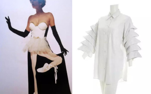 他還會(huì)在衣服胸前綴上精巧的小茶杯剌繡圖案,把短外套鑲滿菱角,以樹熊玩偶制作帽子,利用男士領(lǐng)帶縫制迷你裙。還有,衣服背面清楚標(biāo)明價(jià)錢等等怪招,荒誕的念頭層出不窮。他甚至以垃圾袋制成晚裝,只為了宣告他的“cheap and chic”!